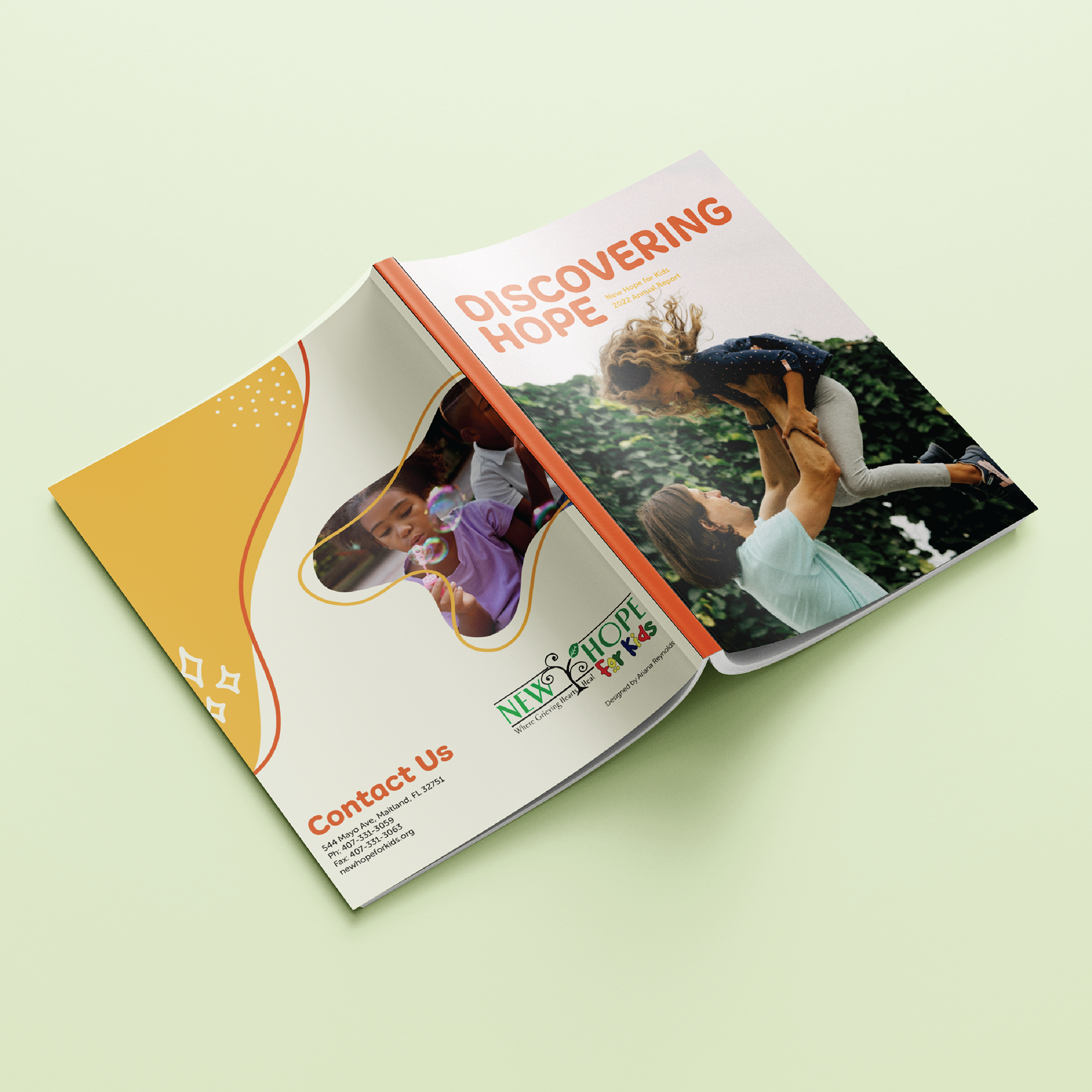 This annual report for New Hope for Kids was designed to showcase the organization's achievements in a way that’s both professional and engaging. While maintaining a polished look, I kept the design friendly and fun, using vibrant colors and approachable layouts to highlight key information and stories, all while staying true to the organization's mission and values.